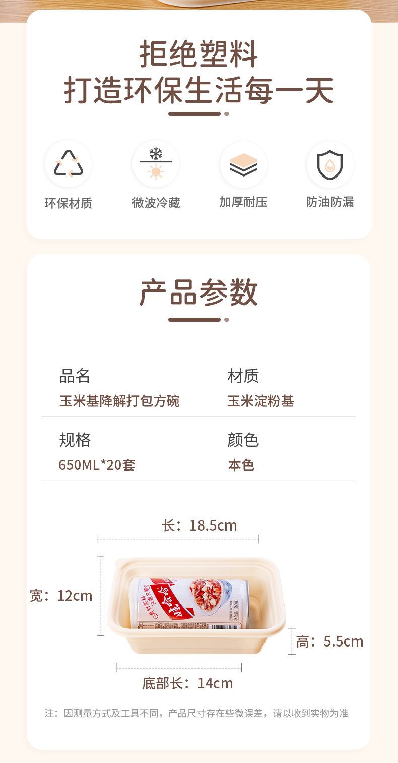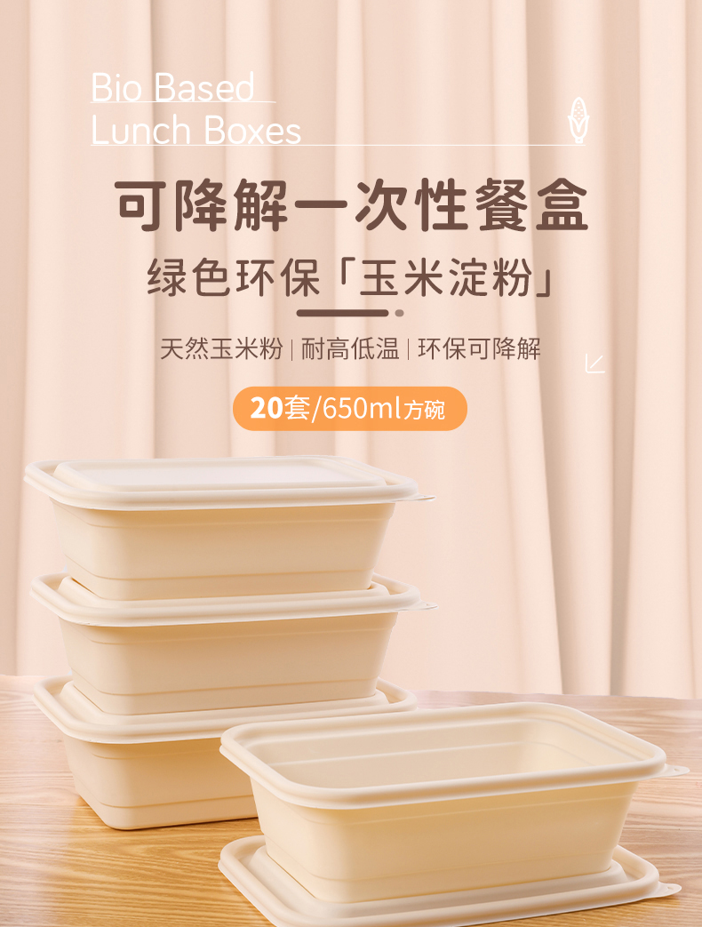 云蕾可降解餐盒一次性玉米淀粉基打包圆碗650ML带盖加厚饭盒餐厅/集体/家用